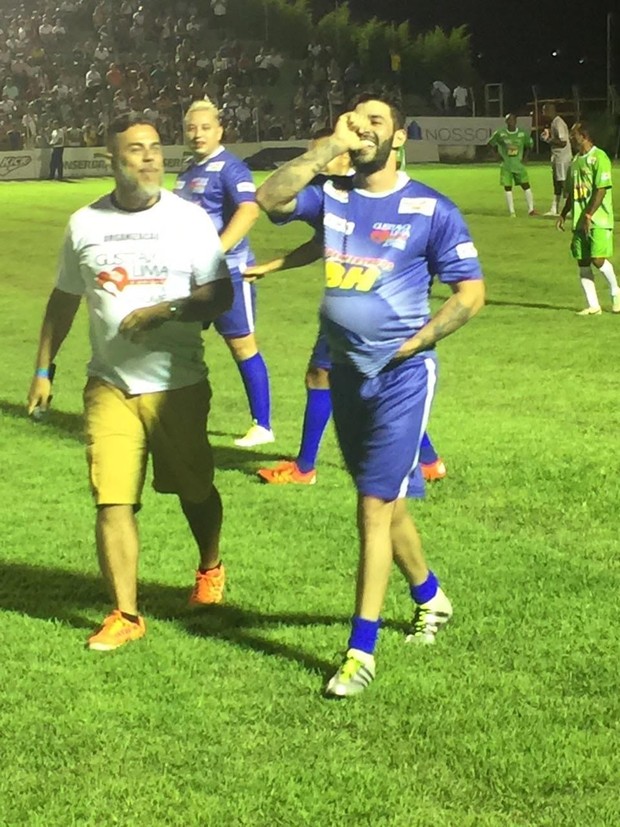 Ao fazer um gol, Gusttavo Lima colocou a bola dentro da camiseta e faz uma homenagem ao primeiro filho que espera de seu casamento com Andressa Suita.